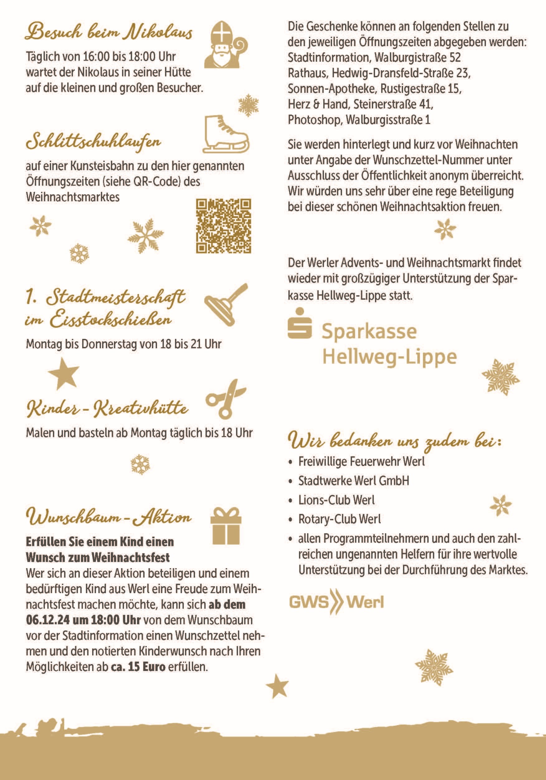 Veranstalter des Werler Advents- und Weihnachtsmarktes ist die Gesellschaft für Wirtschaftsförderung und Stadtentwicklung mbH Werl und wird dabei großzügig von der Sparkasse Hellweg-Lippe unterstützt.