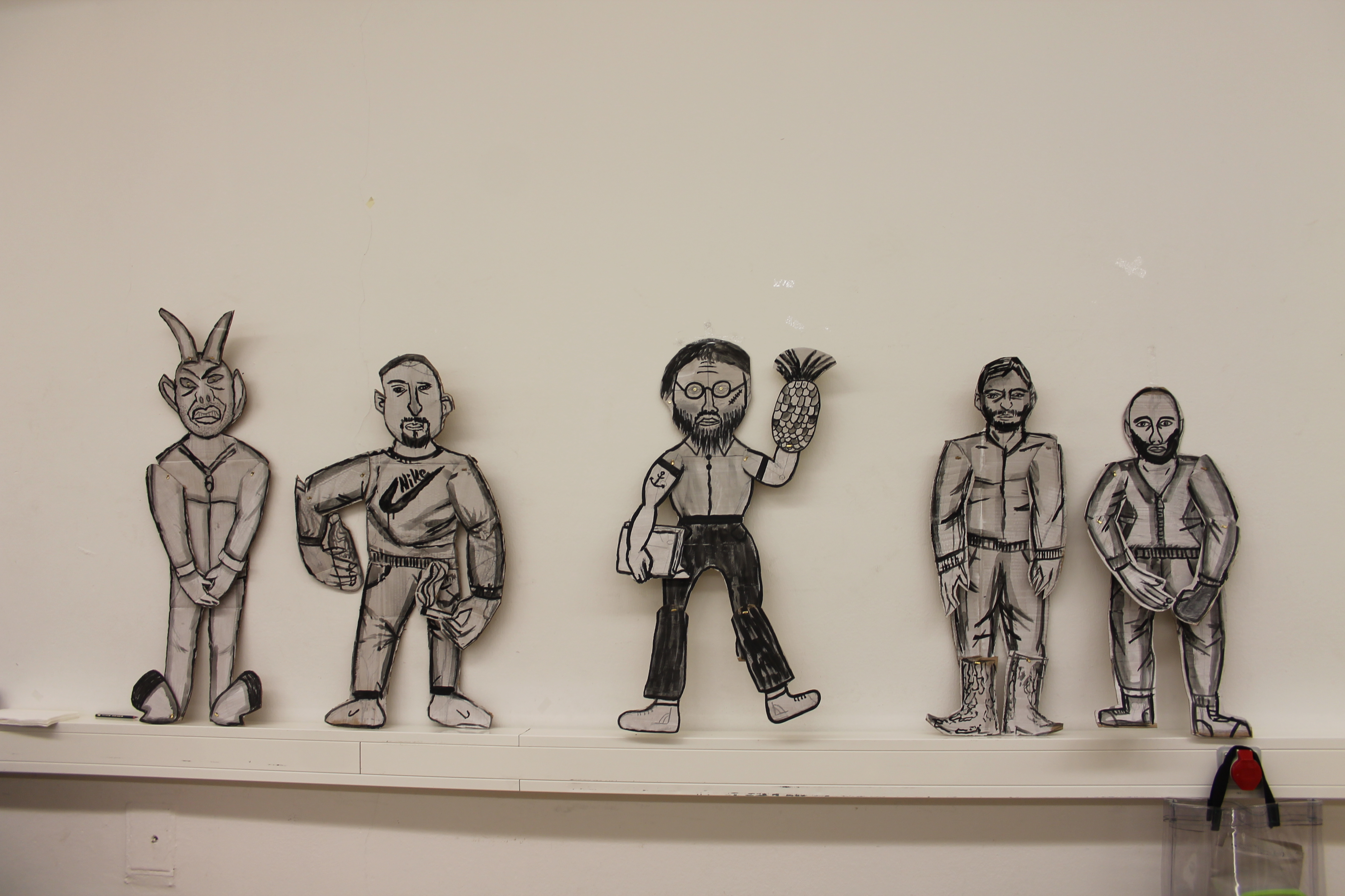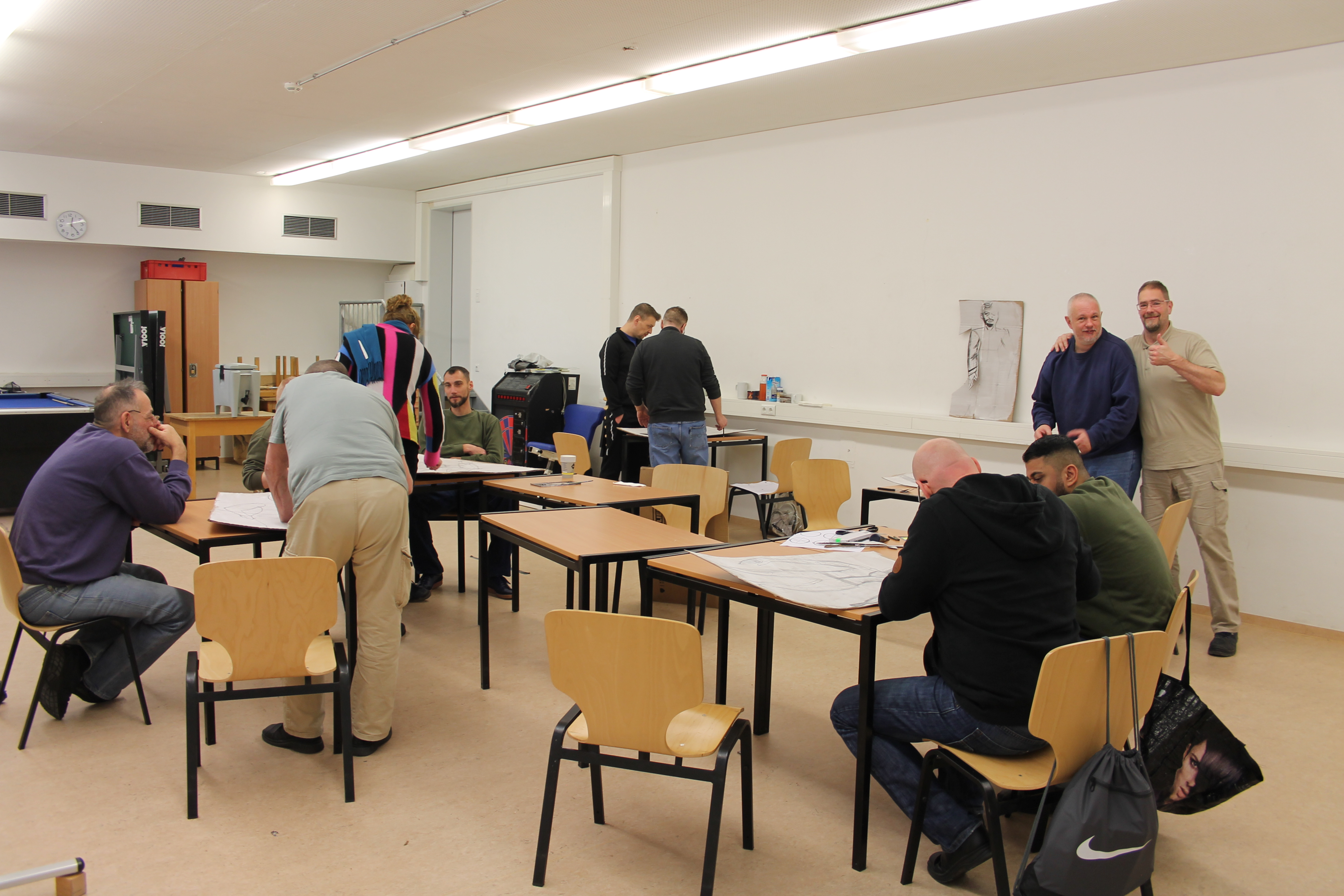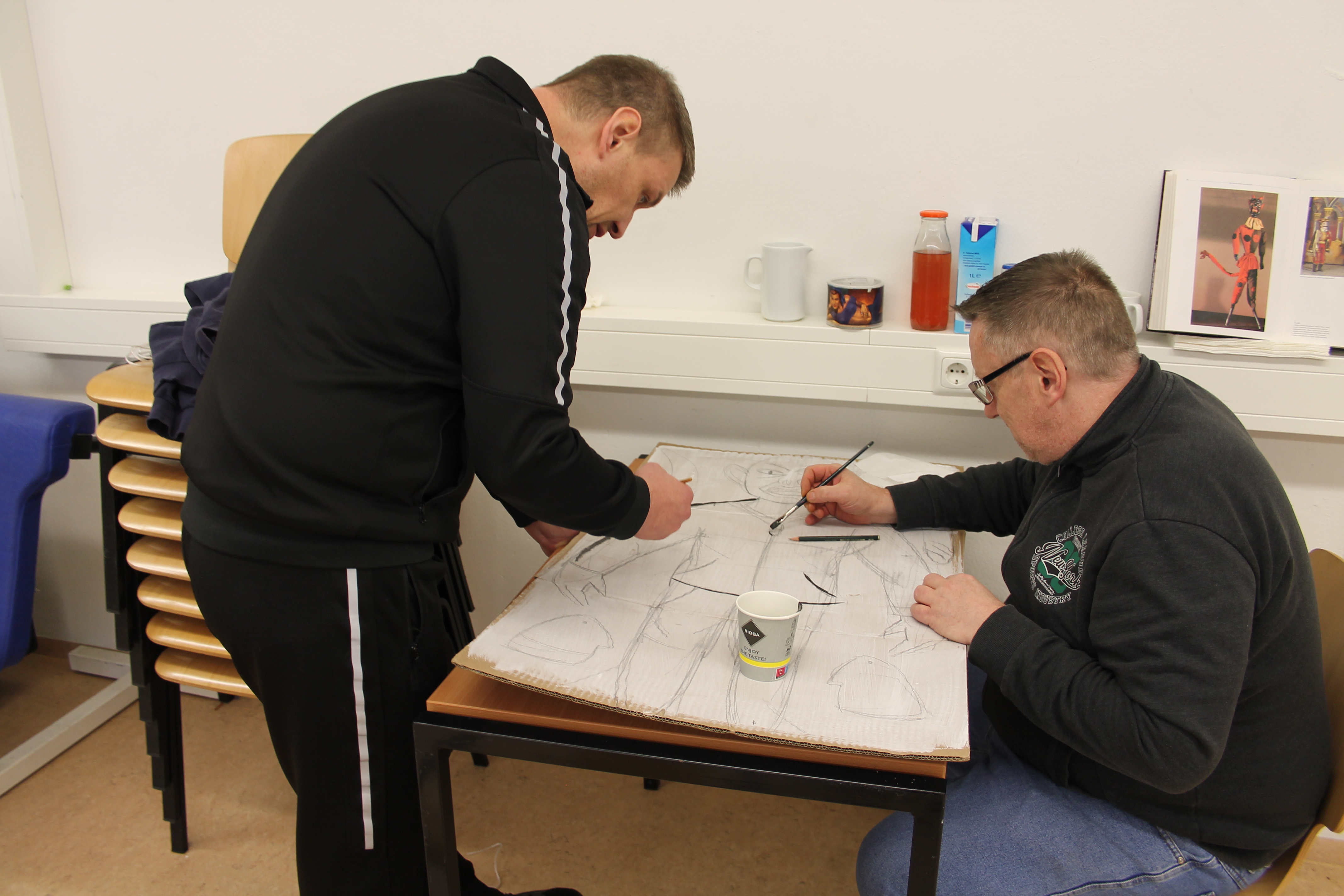 Den Auftakt im Workshop machte Patricia Thoma, eine Künstlerin, Illustratorin und Autorin aus Berlin. Sie hatte große weiß getünchte Pappkartons, Stifte und Farben mitgebracht. Daraus sollten die Gefangenen Avatare basteln, die später beim Theaterspielen/Film zum Einsatz kommen könnten. Das sorgte zunächst für Unmut bei den Teilnehmern, die mit dem Kopf mehrheitlich beim Theaterspielen waren. Trotz der anfänglichen Schwierigkeiten legten sich alle ins Zeug und am Ende kam eine ganze Reihe von Avataren zum Vorschein die durchweg mehr als gelungen war.