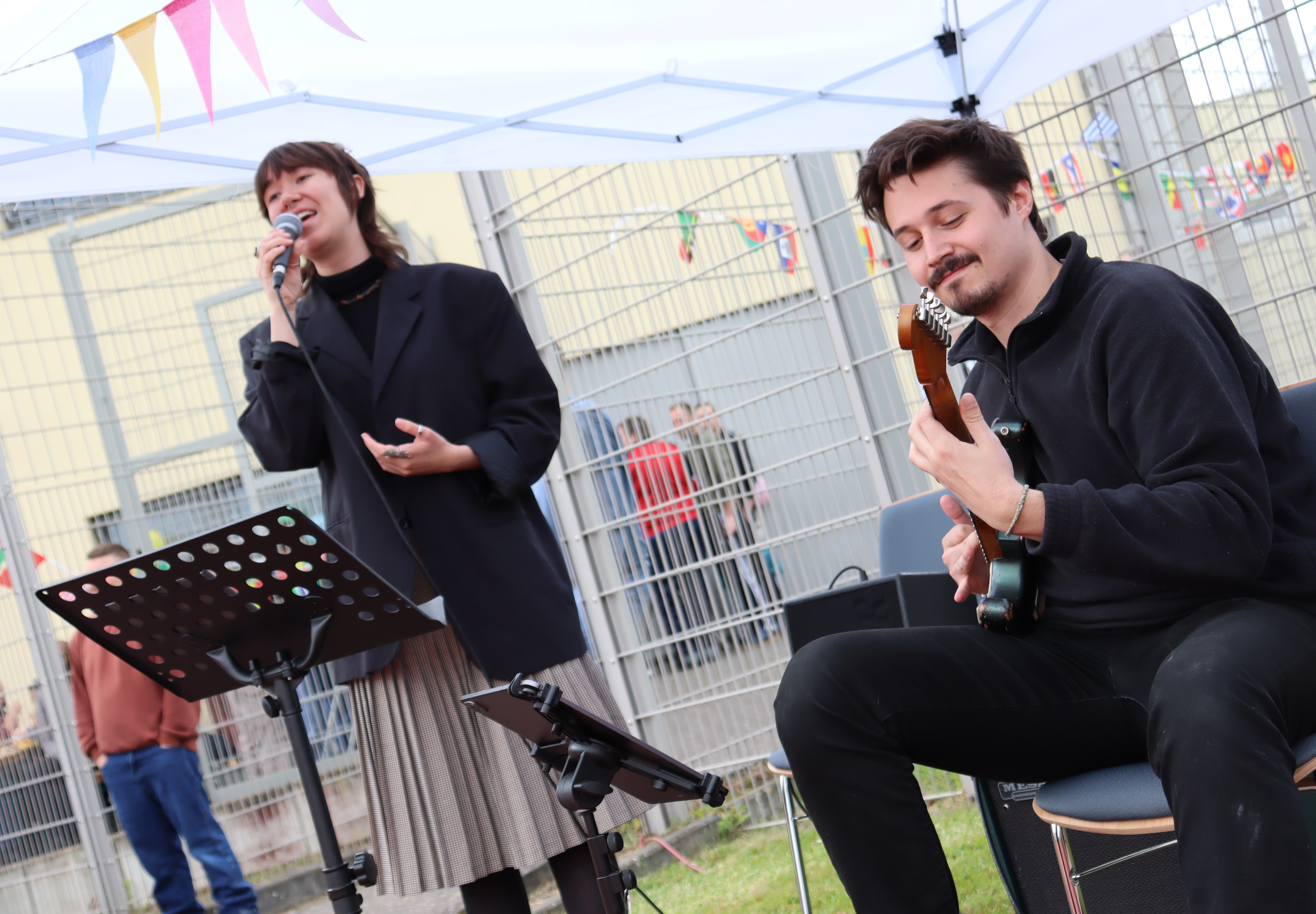 Und das Wetter spielte glücklicherweise ebenso mit wie die gute Laune und das gute Benehmen aller Beteiligten. Anstaltsleiterin Renate Gaddum begrüßte die Gäste, Freizeitkoordinator Rudolf Armbruster kündigte die Live-Bands an: Merle Böwering und Donovan Tusk vom Verein „Live Music Now“ aus Köln brachten Jazz zu Gehör. Der neue Evangelische Pfarrer Carsten Schraml nutze die Bühne, um sich allen vorzustellen und eine Kostprobe seines musikalischen Talents in Kooperation mit dem Kirchenchor zu geben. Anschließend sang ein Inhaftierter arabische und türkische geistliche Lieder, begleitet von einem weiteren Inhaftierten mit der „Saz“, einer Langhalsgitarre.